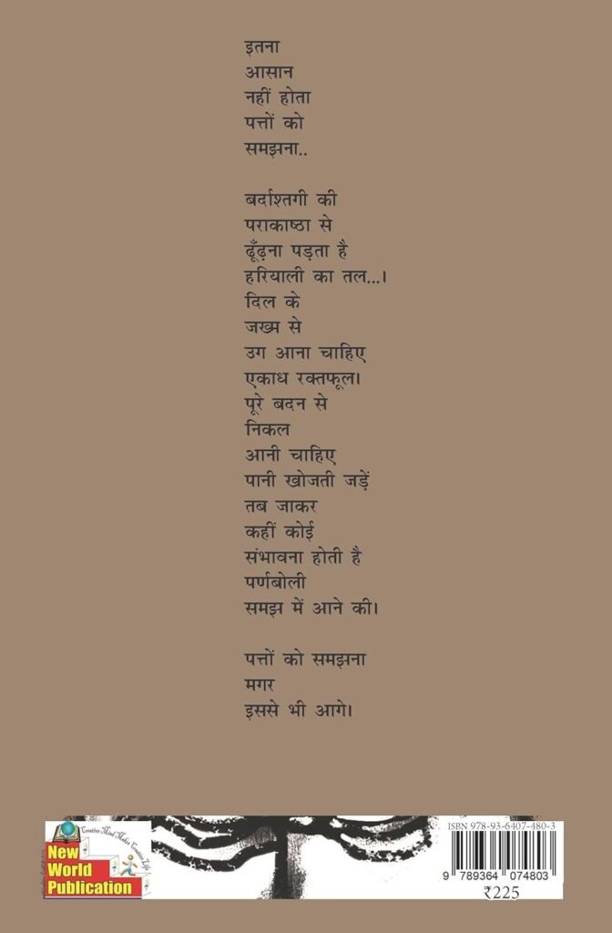 मेरी जानकारी में शायद हिंदी साहित्य में यह पहला कविता संकलन है; जो पुरी तरह प्रकृति के सबसे कोमल और चंचल पर्ण (पत्ते) को माध्यम बना कर लिखा गया है । पत्ते के माध्यम से ही कवि मानव जीवन के हर पहलू को हल्के से स्पर्श कर देता है और ये स्पर्श विविध रंगो में आयातीत है. सुख दुःख, स्वभाव, विवेक से लेकर इंसान के छल विच्छोह, उछाह को भी बड़े ही रुमानियत तरीके से दर्ज करता है । इसमें समानता की बात करता है; विषमता की बात करता है.;कहीं कहीं तो इनकी पंक्तियाँ एकदम से दार्शनिक हो जाती है । संदर्भ देखिए:-