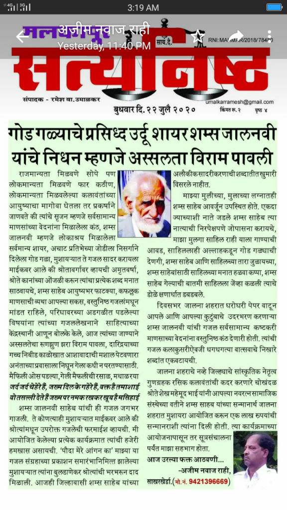 असं बाणेदार पण हसत हसत बोलणारे ऊर्दू /हिंदी चे प्रख्यात शायर शम्स जालनवी यांचं आज वयाच्या 97 व्या वर्षी दु:खद निधन झालं … शम्स साहब ! हे जरी ऊर्दू लिहिणारे आणि बुजूर्ग असले तरी त्यांचा वावर नेहमी मराठी लिहिणा-या जुन्या -नव्या कवी, लेखकांमध्ये असायचा . जालन्यात अत्यंत गरीब परिस्थीतीत जीवन जगतांना अजन्म सायकलवर न्यूज पेपर वाटणारा हा कवी शायरीच्या दरबारात मात्र शहनशहा होता . आणि तिथं त्यांना ऐकणारा प्रत्येकजण अगदी भारावून जात असे. त्यांची स्मरण शक्ती आणि आवाज याही वयात अचंबित करणारा होता.. भावनेनं ओथंबलेली त्यांची शायरी जीवनाचं अलौकीक तत्त्वज्ञान अगदी सहज साधेपणाने व्यक्त करते . गज़ल गाताना शब्द उच्चारण्यातील त्यांची नजाकत इतकी लाजवाब होती की..पत्थर दिल माणूसही विरघळून जात असे .